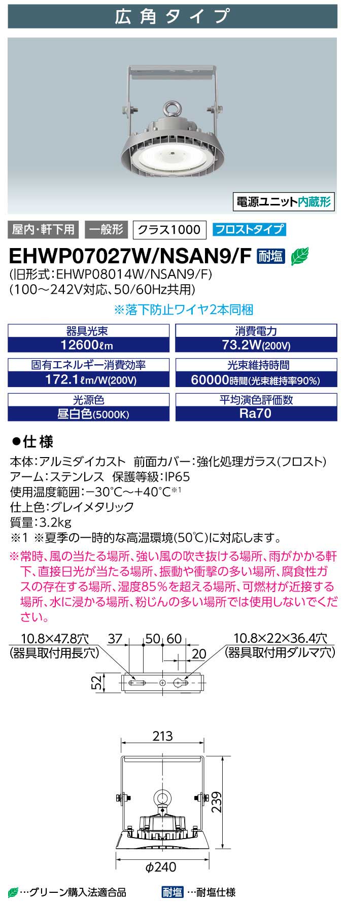 EHWP11027W/NSAN9/F || LED¹âÅ·°æÍѾÈÌÀ´ï¶ñ ´äºêÅŵ¤ LEDioc HIGH-BAY¦È(¥¯¥é¥¹2000)<¥Õ¥í¥¹¥È¥¬¥é¥¹> ²°ÆâŽ¥¸®²¼ÍÑ(IP65) ÅŸ»Æâ¢¡ãÂѱö»ÅÍÍ¡ä ¥á¥¿¥ë¥Ï¥é¥¤¥É¥é¥ó¥×400WÁêÅö ¹³Ñ ÃëÇò¿§(5000K) 20000lm Ra70 AC100¡Á242V (µì:EHWP12014W/NSAN9/F) [br]